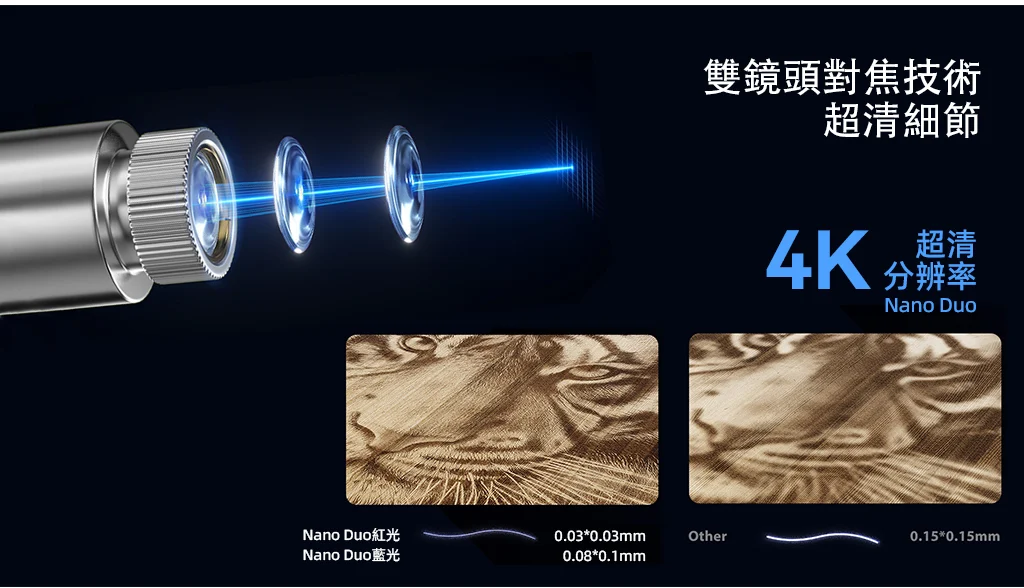 Nano Duo 搭載高階定位與感測系統,確保每一次雕刻皆準確無誤。 其智慧型 1600 萬畫素 AI Eyes 可自動對焦、辨識圖案並填充設計,並在雕刻前提供即時預覽畫面,讓您一眼掌握效果。 整體雕刻流程高度自動化,有效節省時間與操作精力,讓創作更加精準、高效。 ![]() ![]() ![]() ![]() ![]() ![]() ![]() Nano Duo 結合了雙雷射技術,全面提升雕刻表現。2W 紅外線雷射適合精細處理金屬材質,20W 藍光雷射則能對應木材、壓克力、皮革等多種材料,無論軟硬材質、平面或立體表面,都能輕鬆應對。 從細緻刻劃到深度切割,Nano Duo 幾乎可在任何材質上實現出色的雕刻與加工效果。 0.00199mm超高運動精度能確保您創作的每一個細節都精準無誤地呈現,搭配創新AI智慧眼的 225 點位置校準技術,確保邊緣無失真,保證您的雕刻清晰準確。 ![]() ![]() |