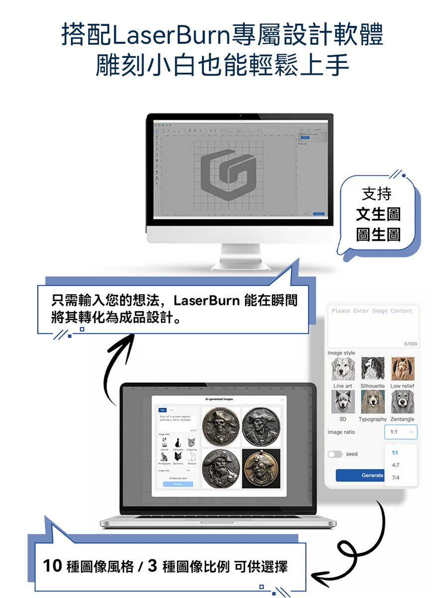 無需專業設計背景,透過 LaserBurn 專屬開發的生成式 AI,只要輸入幾個關鍵詞,就能快速產出多樣化的設計圖樣。 操作介面簡潔直覺,不會設計也能快速上手做出質感作品。